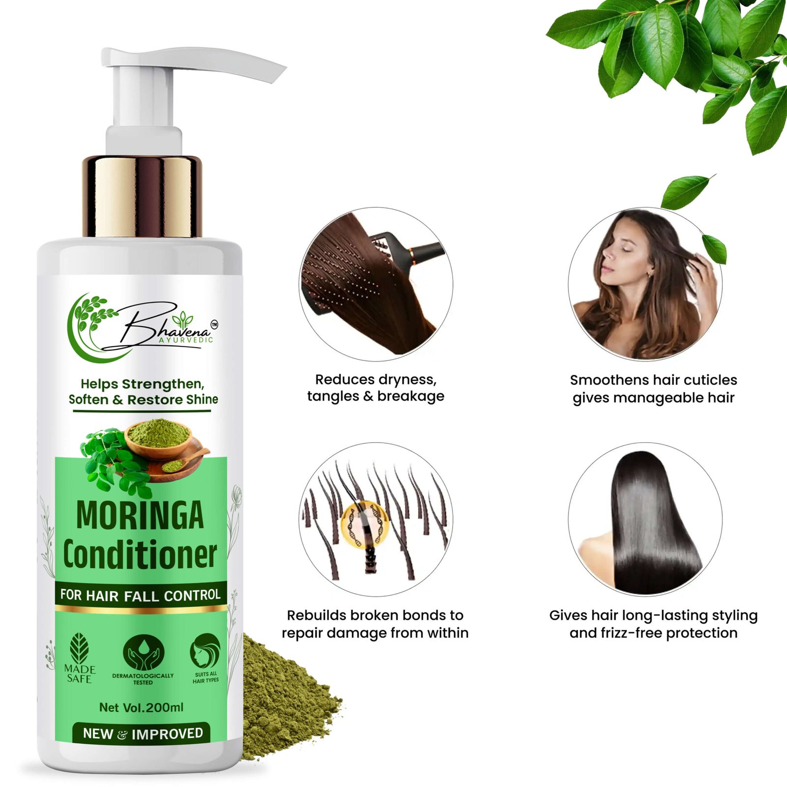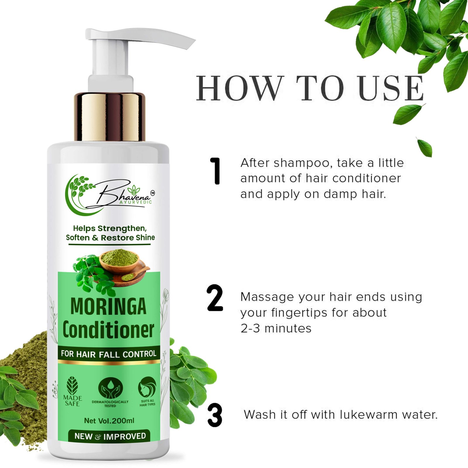 Bhavena Ayurvedic’s Moringa Conditioner deeply nourishes and detangles hair, leaving it soft, smooth, and manageable.